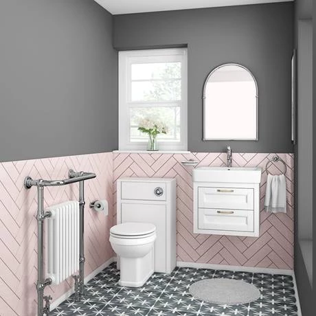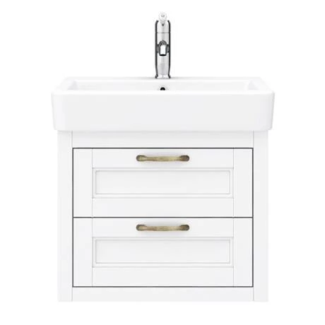 The Chatsworth traditional 560mm wide wall hung satin white vanity unit with gloss white ceramic basin, Victorian inspired design with a modern twist. The Chatsworth range of charming bathroom furniture features classic styling with a satin white finish cabinet and tongue-and-groove side panelling.