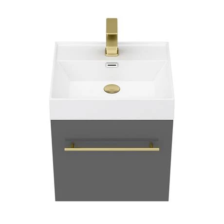 The stylish Valencia 450mm compact vanity unit, features a durable gloss grey cabinet with brushed brass handle and a modern thin edged white gloss polymarble basin. Add innovative sleek design to your bathroom with the minimalist Valencia furniture range, ideal for making a statement in any modern bathroom.Â